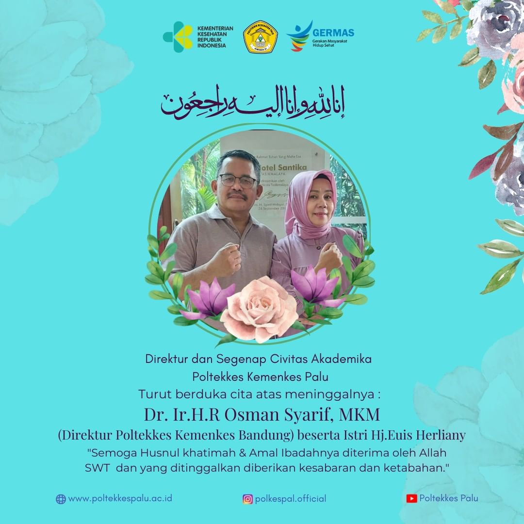 Direktur dan Segenap Civitas Akademika Poltekkes Kemenkes Palu mengucapkan turut berduka yang sedalam-dalamnya atas meninggalnya Direktur Poltekkes Kemenkes Bandung Bapak Dr.Ir.H.R Osman Syarif, MKM dan istri Hj. Euis Herliany