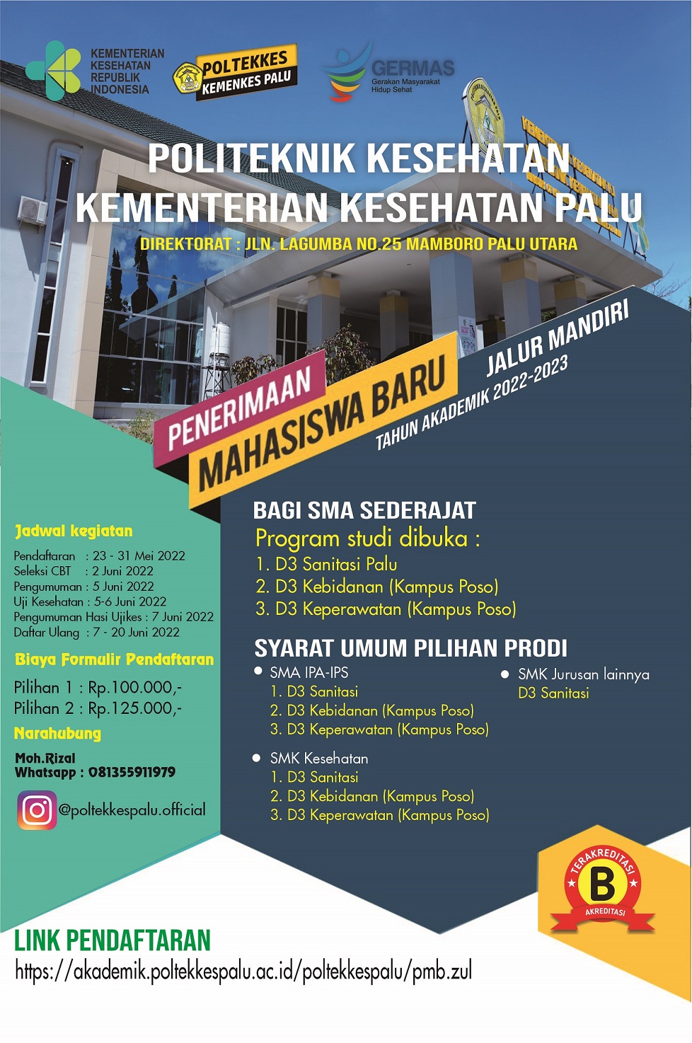Penerimaan Mahasiswa Baru Bagi SMA Sederajat Tahun Akademik 2022-2023 By adminpoltek|2022-05-24T08:33:09+00:00Mei 22nd, 2022|Direktorat, News|0 Comments Share This Story, Choose Your Platform! FacebookXRedditLinkedInWhatsAppTumblrPinterestVkEmail About the Author: adminpoltek Related Posts Cek Kebugaran ASN dan PPNPN Poltekkes Kemenkes Palu Periode II: Komitmen Menjaga Kesehatan dan Produktivitas Gallery Cek Kebugaran ASN dan PPNPN Poltekkes Kemenkes Palu Periode II: Komitmen Menjaga Kesehatan dan Produktivitas UPKSDMK Palu & Morowali Utara: Sinergi Tingkatkan Kompetensi Nakes Gallery UPKSDMK Palu & Morowali Utara: Sinergi Tingkatkan Kompetensi Nakes Promosi Program Studi D-III Gizi Poltekkes Kemenkes Palu ke Sekolah-sekolah di Kota Palu, Kab Donggala, Sigi, dan Parigi Gallery Promosi Program Studi D-III Gizi Poltekkes Kemenkes Palu ke Sekolah-sekolah di Kota Palu, Kab Donggala, Sigi, dan Parigi Poltekkes Kemenkes Palu meraih penghargaan dari Menteri Kesehatan RI Bapak Budi Gunadi Sadikin sebagai “Poltekkes dengan Pemanfaatan Hasil Penelitian Terbaik” Gallery Poltekkes Kemenkes Palu meraih penghargaan dari Menteri Kesehatan RI Bapak Budi Gunadi Sadikin sebagai “Poltekkes dengan Pemanfaatan Hasil Penelitian Terbaik” Peringatan Hari Gizi Nasional 2024, Poltekkes Kemenkes Palu Gelar Pelatihan Kader SIKAT Stunting Gallery Peringatan Hari Gizi Nasional 2024, Poltekkes Kemenkes Palu Gelar Pelatihan Kader SIKAT Stunting Leave A Comment Batalkan balasanYou must be logged in to post a comment.