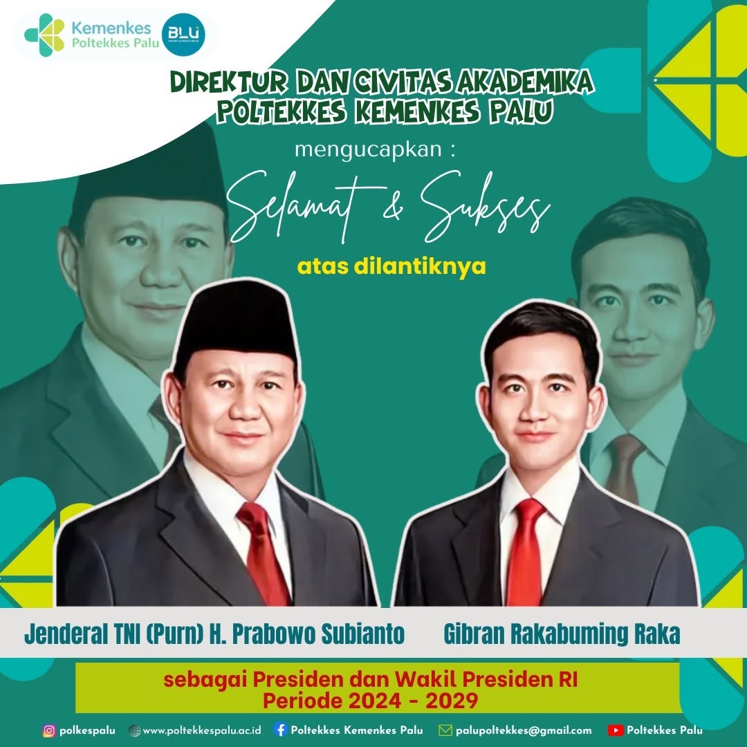Direktur dan Civitas Akademika Poltekkes Kemenkes Palu mengucapakan Selamat dan Sukses atas Pelantikan Bapak Jendral TNI(Purn) H. Prabowo Subianto dan Gibran Rakabuming Raka sebagai Presiden RI dan Wakil Presiden RI. periode 2024-2029.