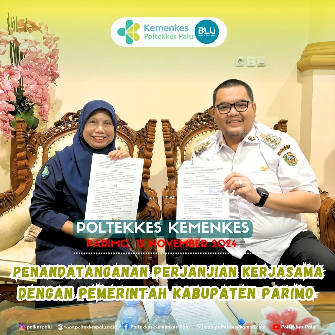 Penandatanganan Perjanjian Kerjasama antara Poltekkes Kemenkes Palu dan Pemerintah Kabupaten Parigi Moutong oleh Plt. Direktur Polkespalu Ibu Nurjaya, SKM.,M.Kes dan PJ. Bupati Parigi Moutong Bapak Richard Arnaldo, SE.,M.SA di Rujab Bupati Parimo.