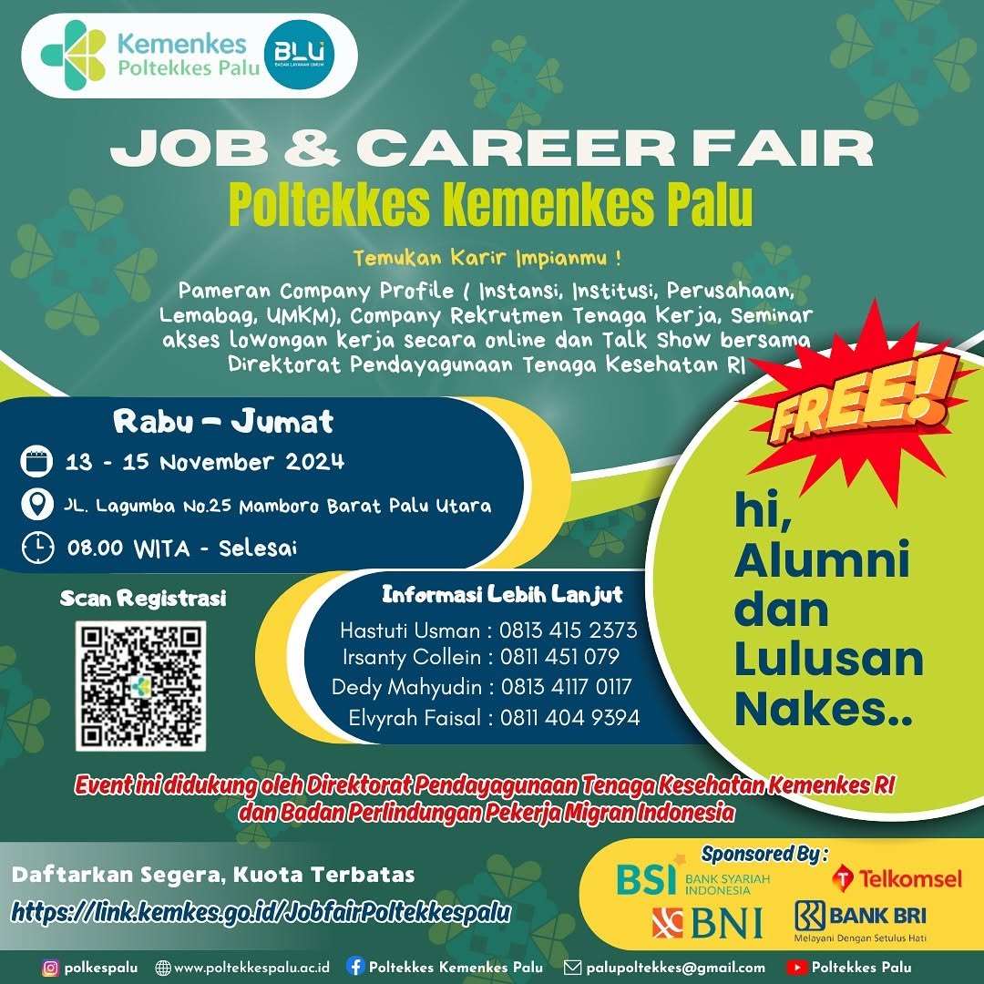 Jangan lupa yah pada tanggal 13-15 November 2024, Poltekkes Kemenkes Palu mengadakan kegiatan Job & Career Fair✨