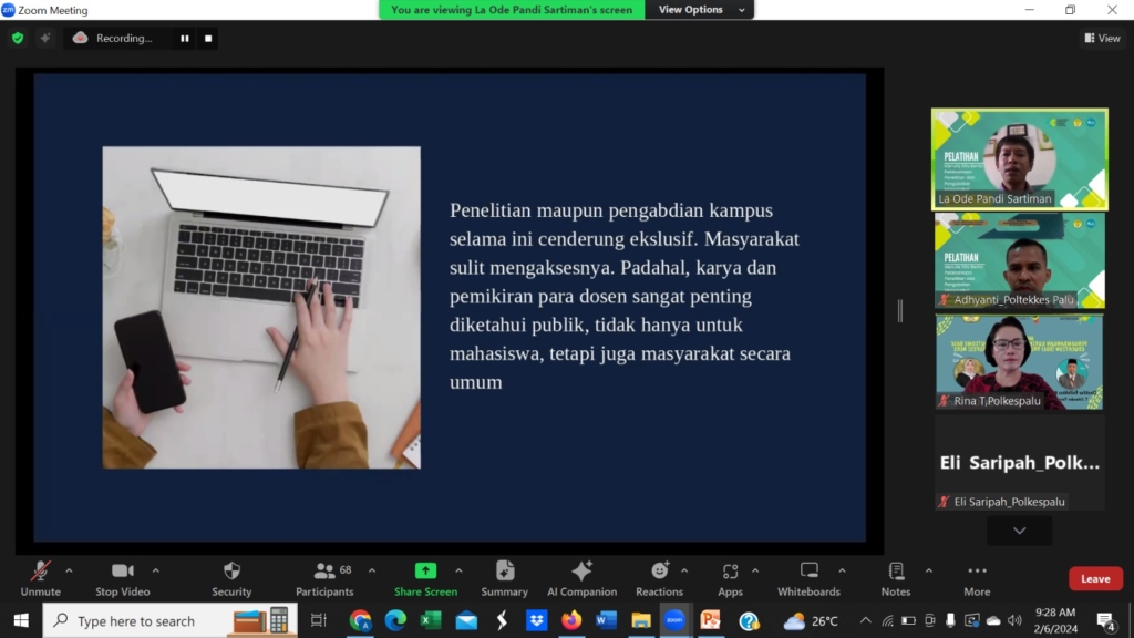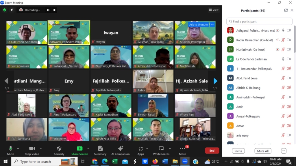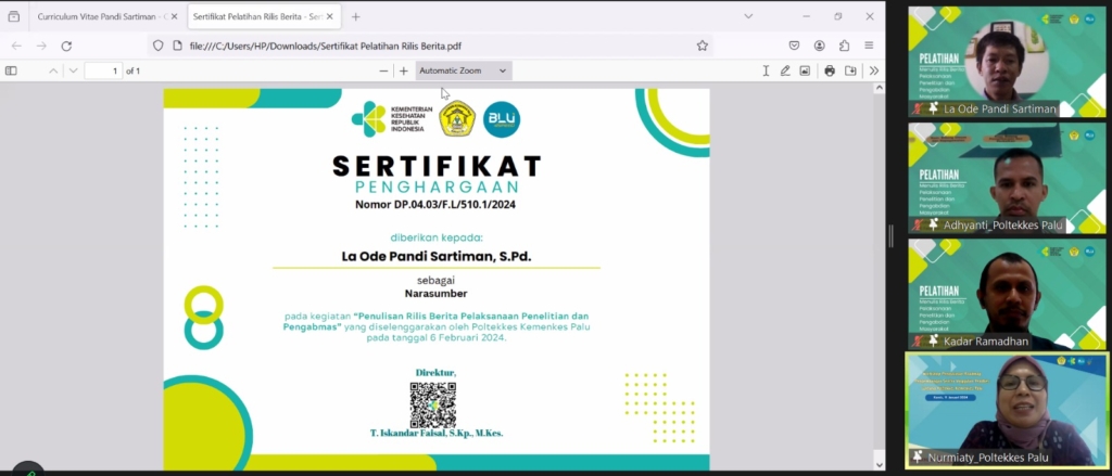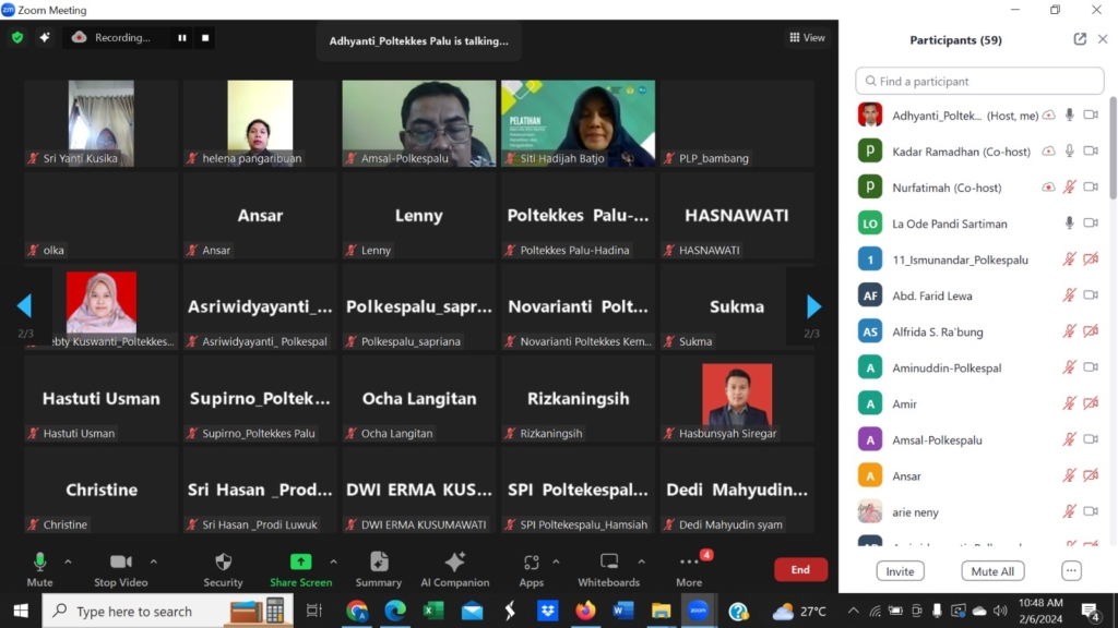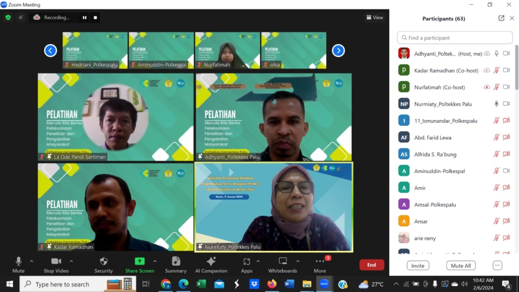 Pusat Penelitian dan Pengabdian Masyarakat (PPM) Politeknik Kesehatan Kementerian Kesehatan (Poltekkes Kemenkes) Palu melakukan pelatihan penulisan press release bagi dosen dan tenaga kependidikan (tendik) pada Hari Selasa (6/2/2024) secara online atau daring (dalam jaringan). Kegiatan ini bertujuan meningkatkan keterampilan dosen membuat berita langsung (straight news) dalam bentuk press release agar kegiatan tridharma terutama penelitian dan pengabdian kepada masyarakat (pangabmas) dapat tersosialisasikan dengan baik kepada masyarakat luas.
