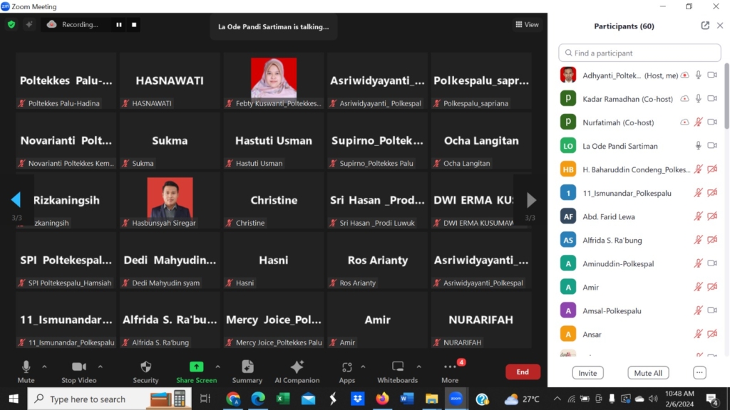 Sebagai informasi, kegiatan ini dimoderatori Adhyanti, S.Gz, M.Si, dosen Jurusan Gizi Poltekkes Kemenkes Palu, sedangkan peserta nya adalah dosen dan PLP dari Jurusan Keperawatan, Jurusan Kebidanan, Jurusan Sanitasi, dan Jurusan Gizi.