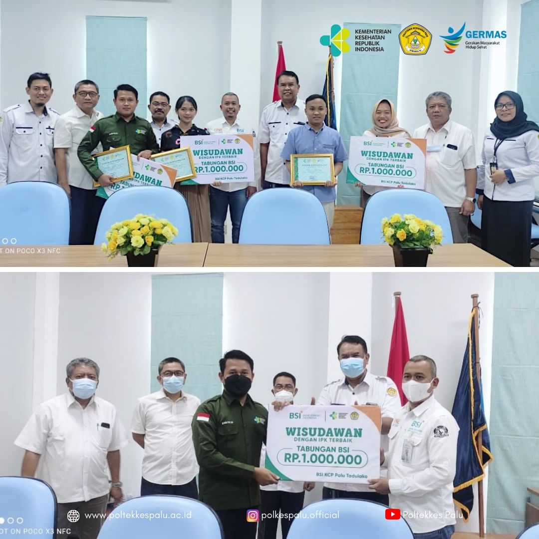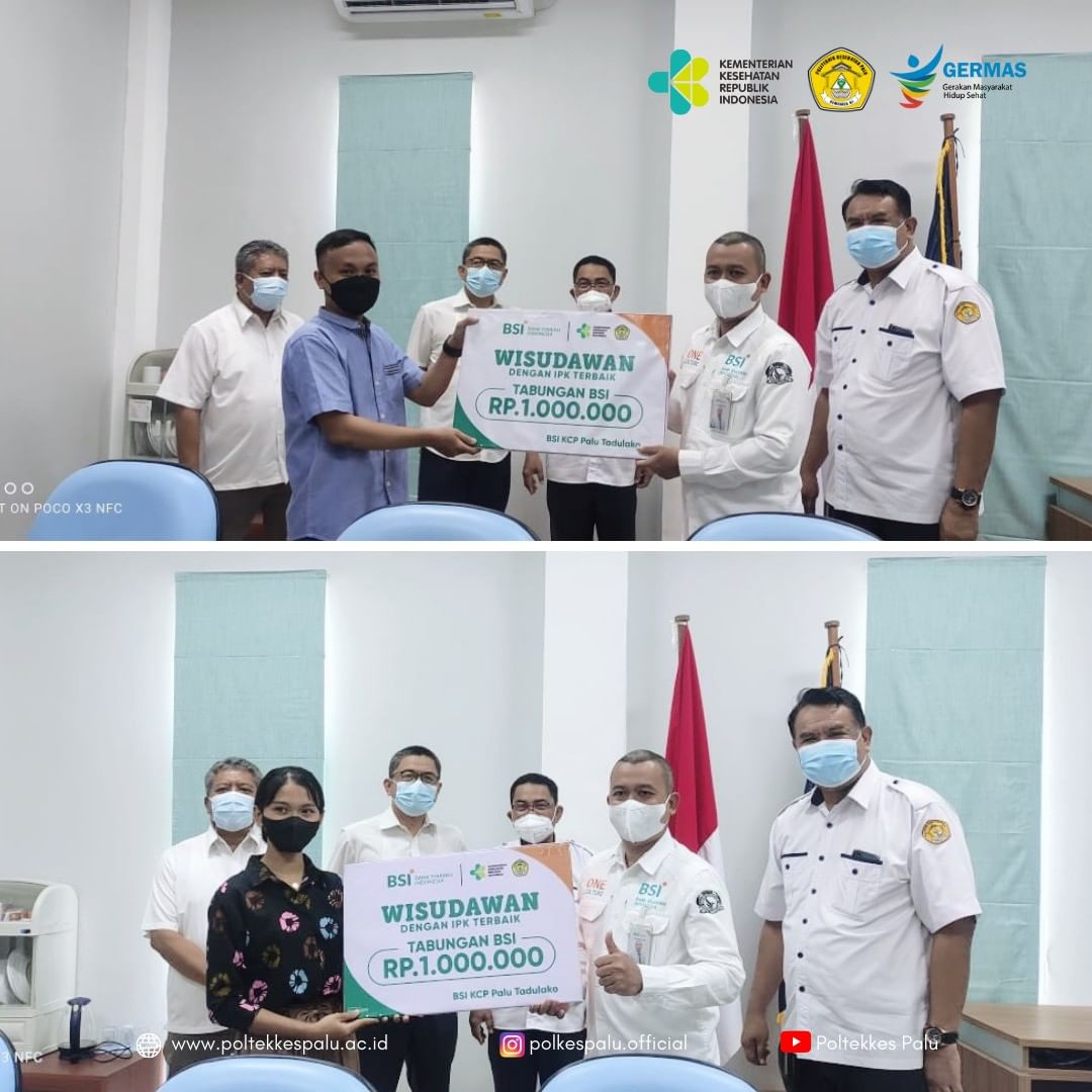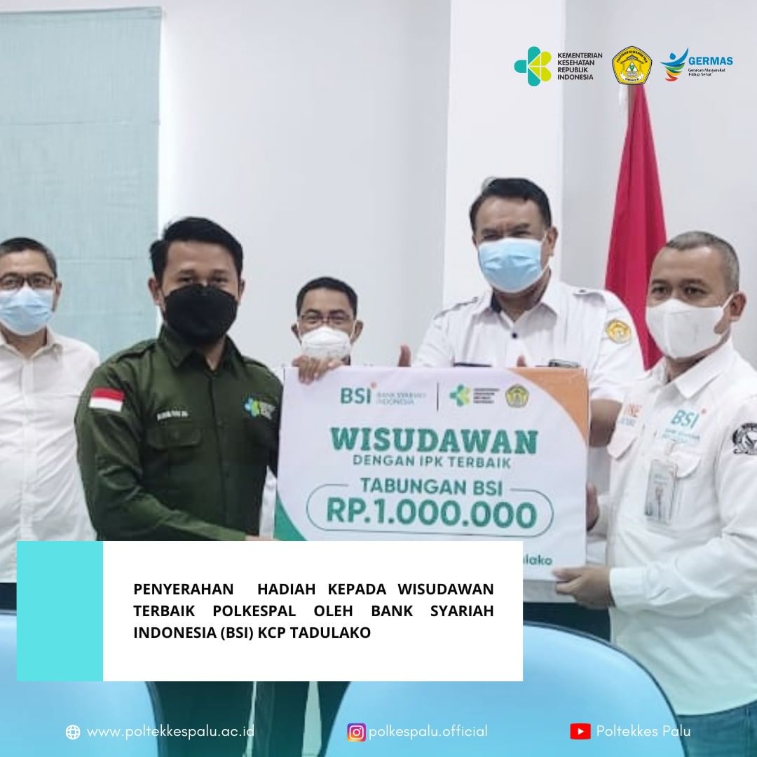 Bertempat di Ruang Rapat Rektorat Polkespal telah di laksanakan penyerahan Hadiah berupa tabungan kepada lulusan terbaik Polkespal yang bersumber dari Bank Syariah Indonesia yang pada kesempatan ini diserahkan langsung oleh Kepala Cabang Bank BSI KCP Tadulako Bapak Mohammad Hidayat, kegiatan ini juga di hadiri oleh Direktur Polkespal , para Wakil Direktur, Kapus Penelitian & Pengabdian Masyarakat, Kasubbag ADAK dan bagian akademik kemahasiswaan. Penyerahan hadiah ini sebagai bentuk reward kepada lulusan serta semoga dapat menjadi motivasi bagi mahasiswa lainnya.