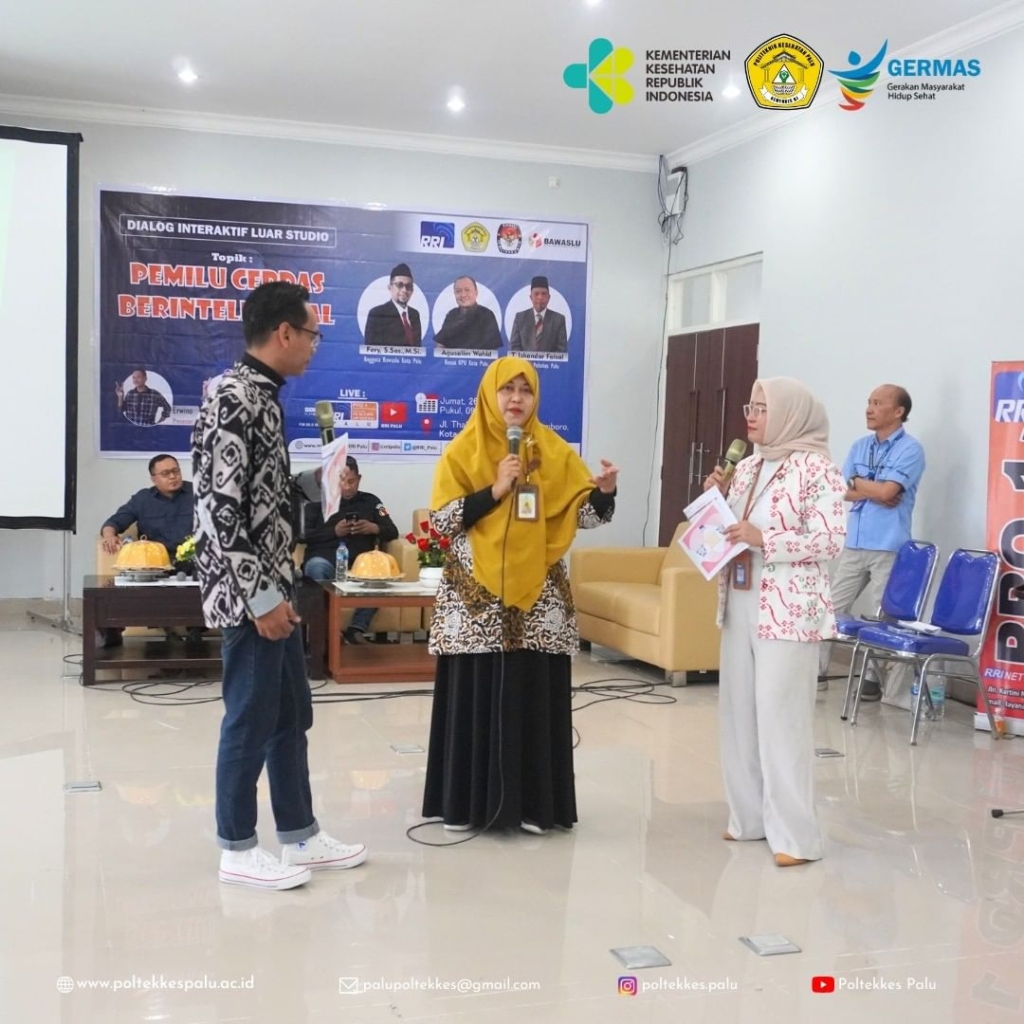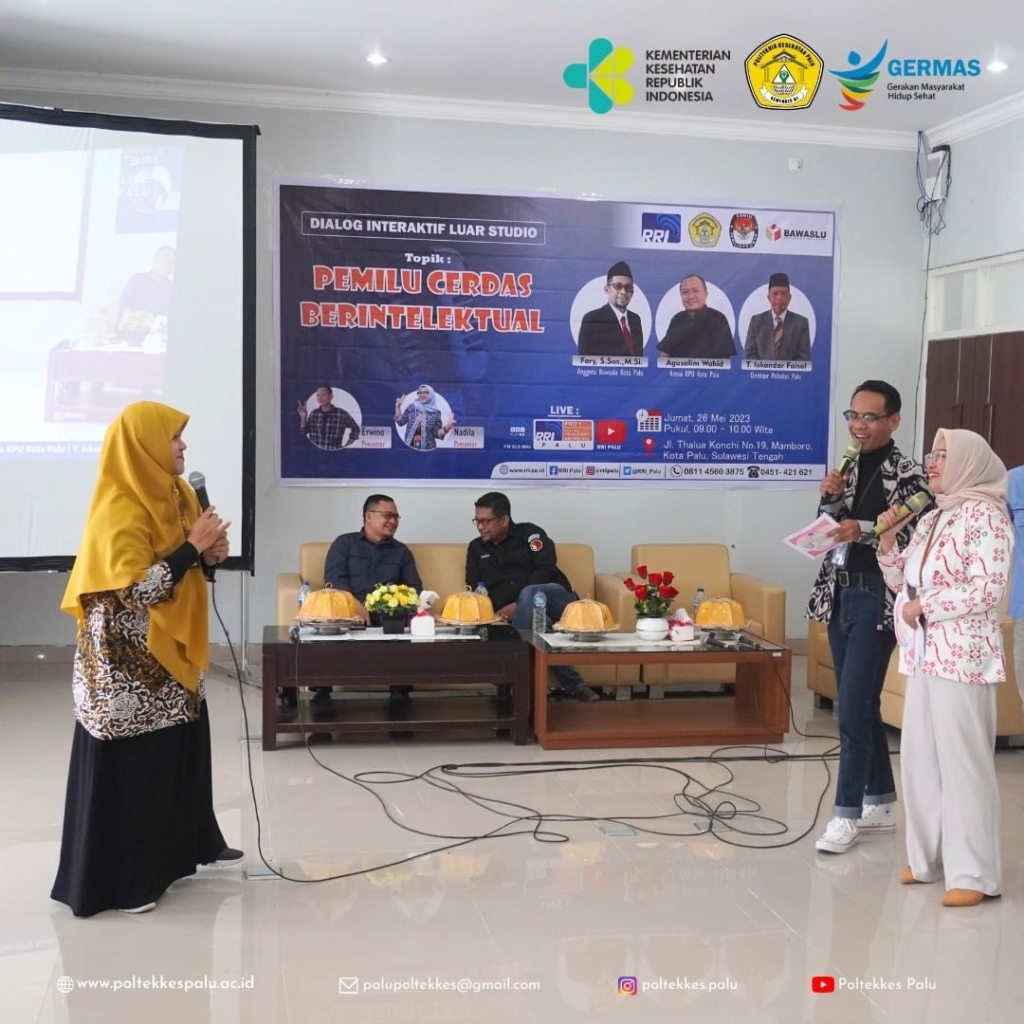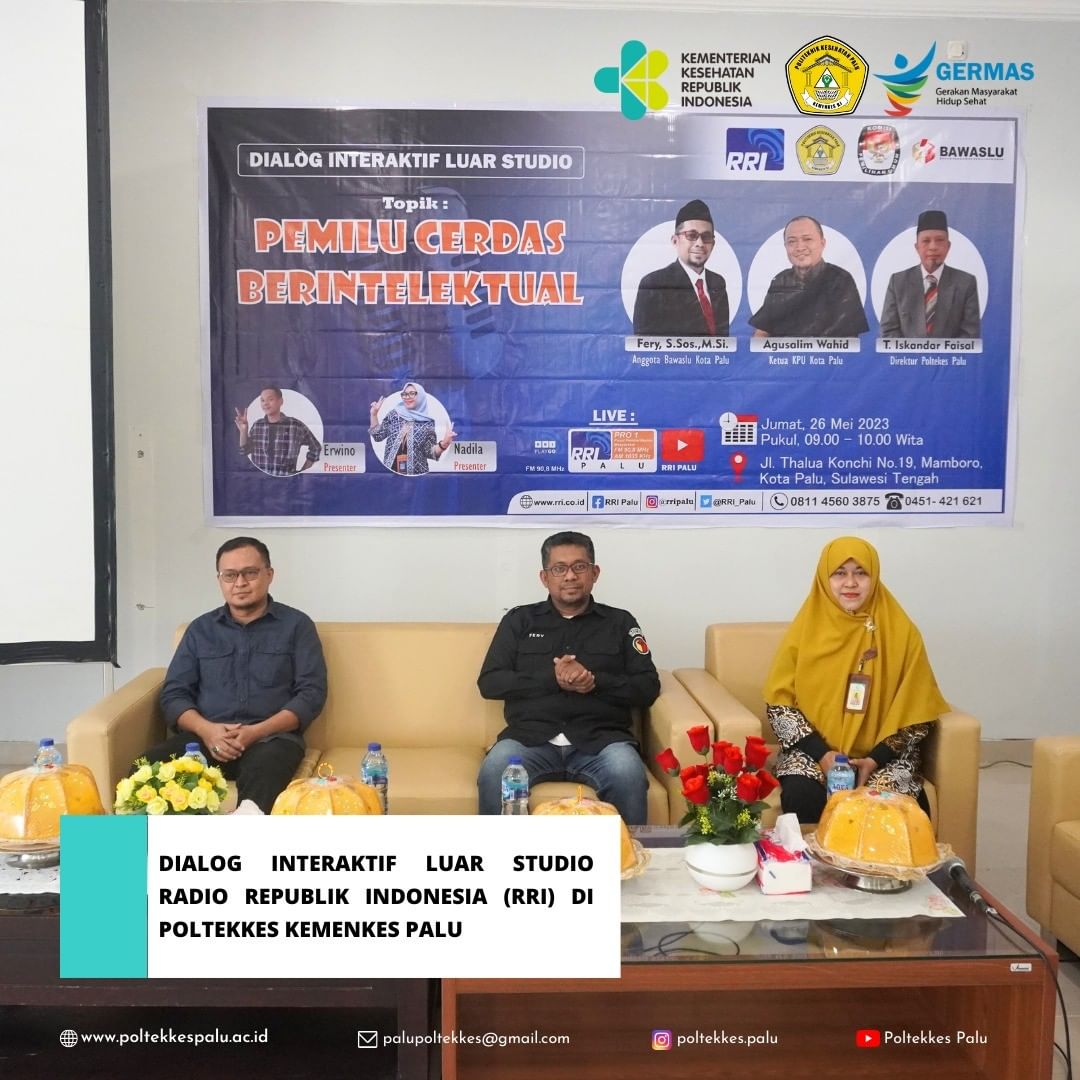 Radio Republik Indonesia (RRI) Sulawesi Tengah melaksanakan Kegiatan Dialog luar Studio di Kampus Poltekkes Kemenkes Palu. Bertempat di ruang pertemuan Rektorat Poltekkes Kemenkes Palu dengan topik “Pemilu Cerdas Intelektual” ,kegiatan yang dihadiri oleh Wakil Direktur III Ibu Sumiaty, SST., MPH bersama dosen serta mahasiswa Polkespalu ini berlangsung meriah. Hadir sebagai narasumber bapak Agusalim Wahid Kepala Komisi Pemilihan Umum (KPU) Kota Palu dan Bapak Fery S.Sos, M.Si anggota Bawaslu Kota Palu.